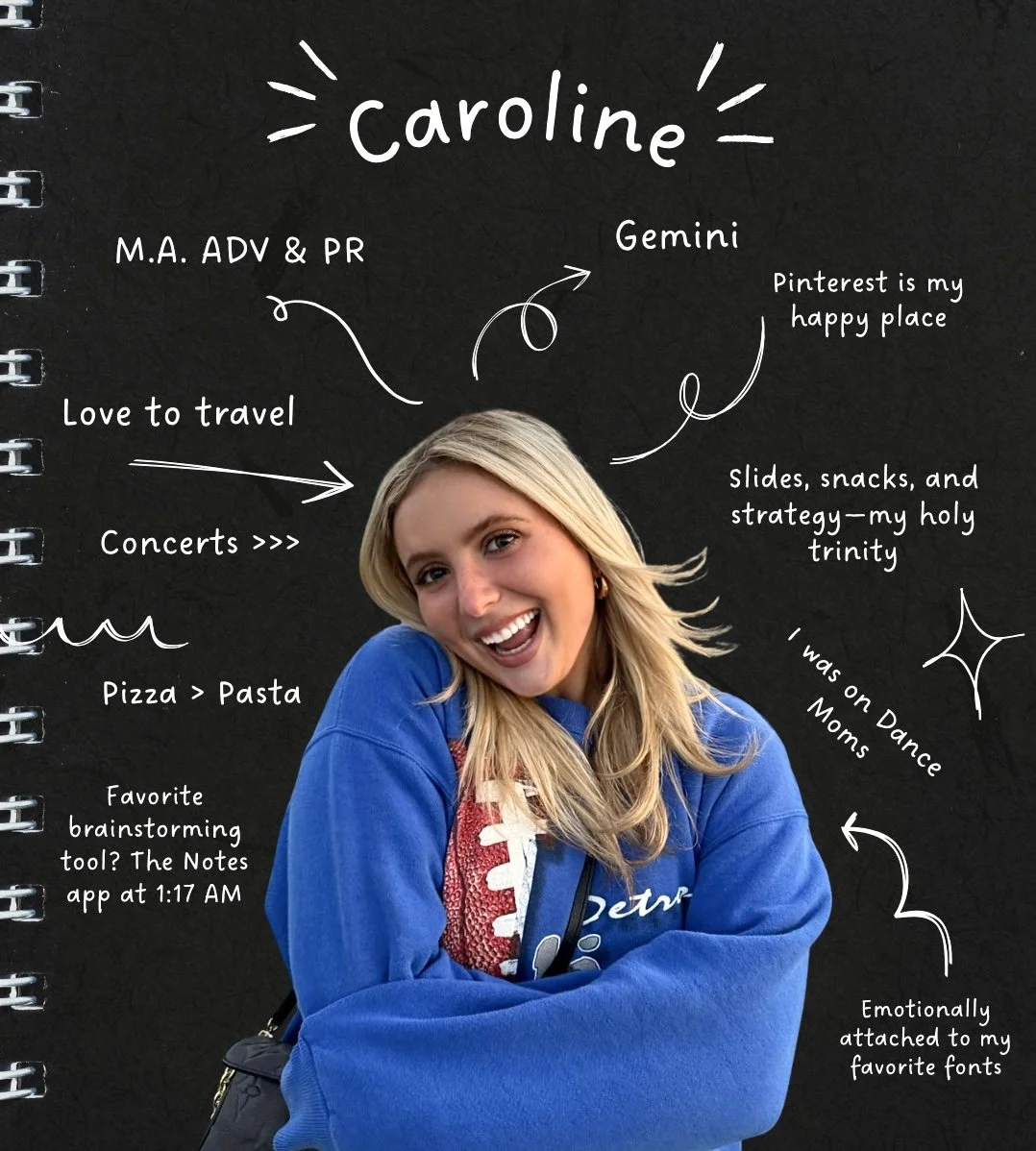Hi! I’m Caroline Kubek, a 23-year-old from Michigan with two degrees, a thousand playlists, and a deep love for advertising.